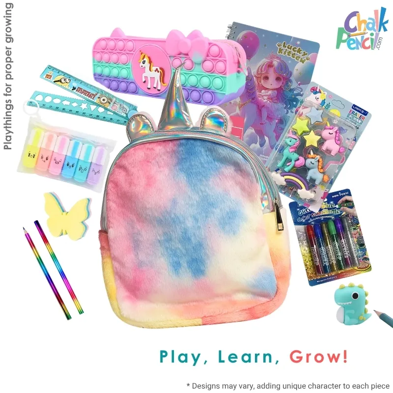 The Unicorn Kids Bag Pack Set is a comprehensive 10‑in‑1 kit designed for students and young artists. This all‑inclusive bundle provides essential school gear and creative tools in one coordinated package. Inside the set, you will find a durable backpack and a matching pencil case to keep supplies organized. For creative projects, the kit includes rainbow pencils and glitter glue, making it a versatile choice for both classroom learning and home art sessions.