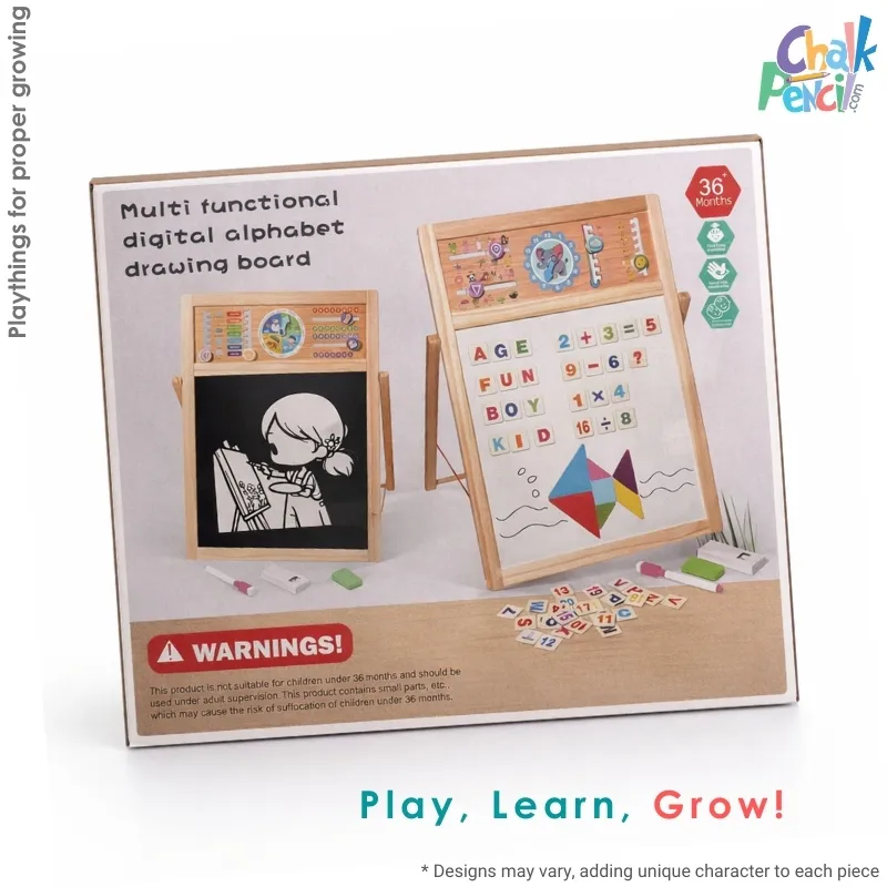 The Kids Educational Study Board with Arabic Letters is a multi-functional learning tool designed for children aged 36 months and above. This comprehensive set features a double-sided design with a chalkboard on one side and a magnetic whiteboard on the other. It includes a variety of educational aids such as magnetic Arabic and English alphabets for word formation, alongside numbers for basic math practice. The board also integrates learning tools for telling time, identifying days of the week, and naming months. Children can improve their spatial awareness using the included colorful geometric shape puzzles. For creative activities, the kit provides chalk, a whiteboard marker, and an eraser. The product is constructed from wood and comes in a package with a box size of 36.5x46 cm. It is an ideal resource for developing cognitive skills, fine motor control, and linguistic foundations in a fun, interactive way.