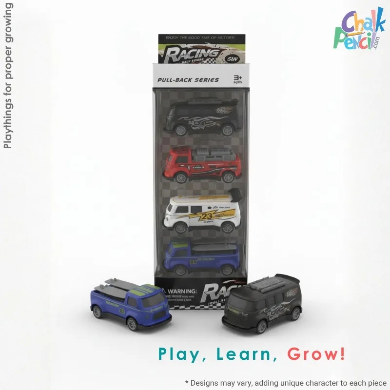 Shop the Racing Pull‑Back Series Car Set. Includes 4 diecast toy cars (8.5 cm) made of ABS plastic. Features fun pull back action for kids aged 3 plus.