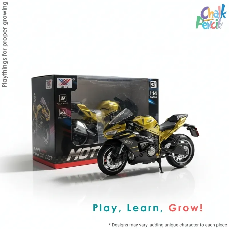 Shop the Moto Racing Die‑Cast Yellow. This 1:14 scale alloy metal bike features pull back action and high‑quality details. 12 cm long for ages 3+.