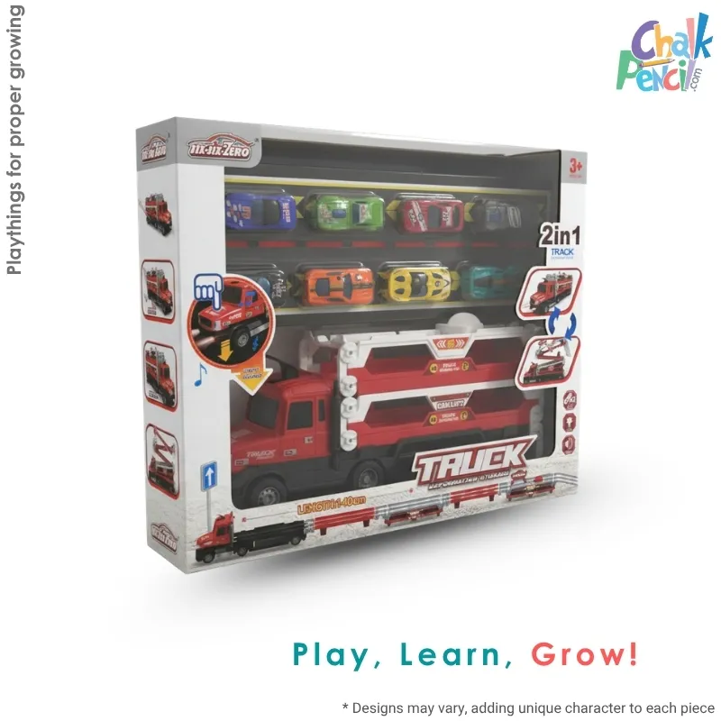 The 2 in 1 Track Container Truck is a versatile toy set designed for children aged 3 years and above who enjoy automotive play and creative racing. This SIX‑SIX‑ZERO branded set features a large red fire truck that functions as both a storage container and a transformable racing circuit. Inside the box, you will find the main container truck and 8 colorful alloy cars in various styles. The core feature is the foldable track that extends to a length of 140 cm, providing a long path for the alloy vehicles to speed through. The truck is equipped with realistic light and sound effects to make the racing experience more engaging. Children can use the car lift and parking areas to organize their fleet before launching them down the extended track. This toy helps develop fine motor skills and spatial awareness through hands‑on transformation and vehicle management. It offers a practical solution for both active play and organized car storage.