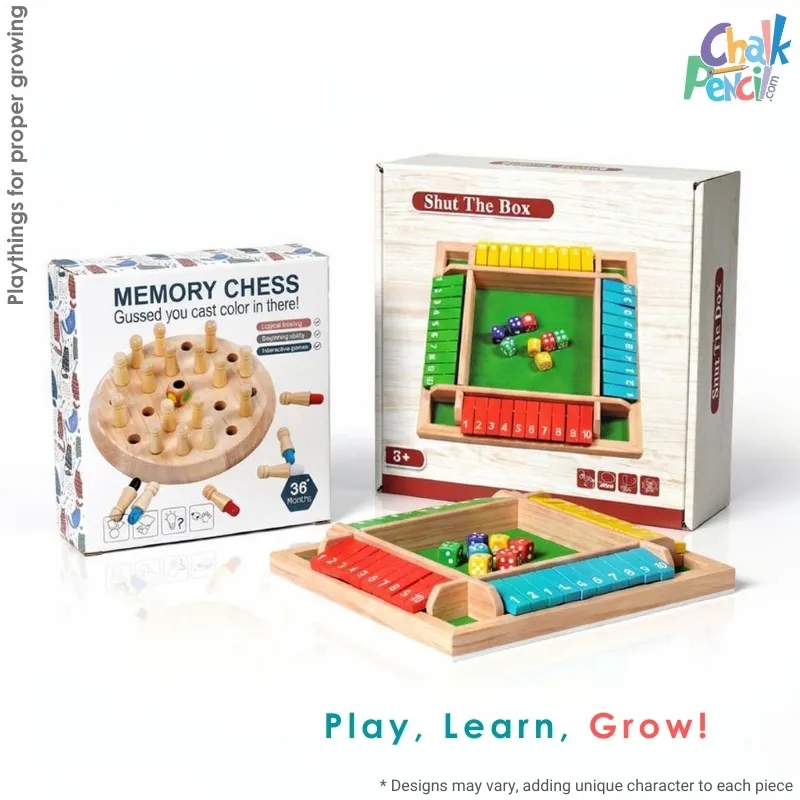 Includes two wooden board games: Memory Chess and Shut The Box.